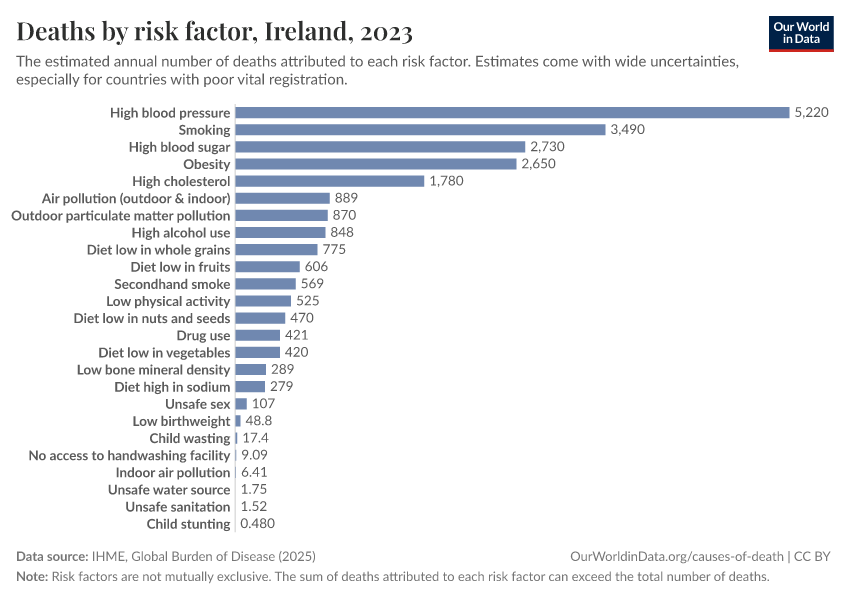 In the chart, you can see modeled estimates for how many people in Ireland die prematurely as a result of various risk factors. Note that the same death can be attributed to multiple risk factors, so the death tolls from different risk factors cannot simply be added up (this is why their sum can be higher than the total number of deaths).