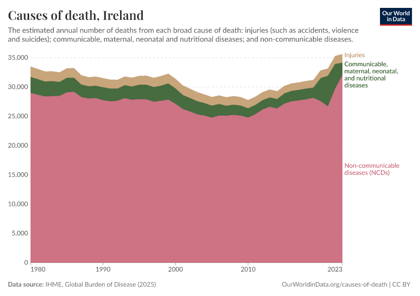 In the chart, you can see the breakdown of deaths in Ireland by these broad categories. In 2023, 2,110 died from communicable diseases, 32,000 from NCDs, and 1,460 from injuries.