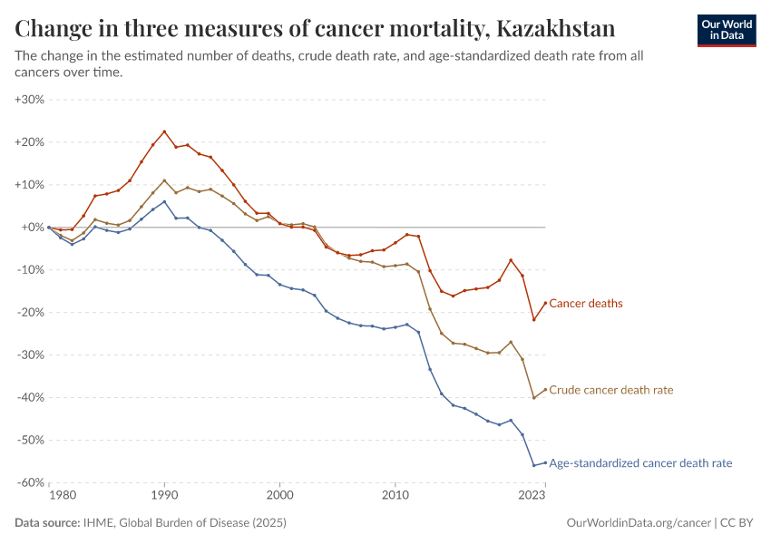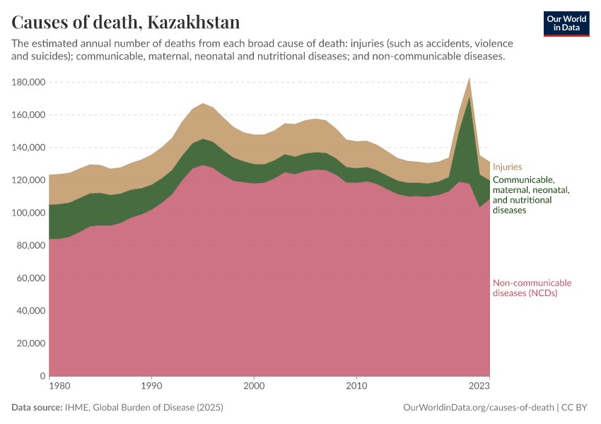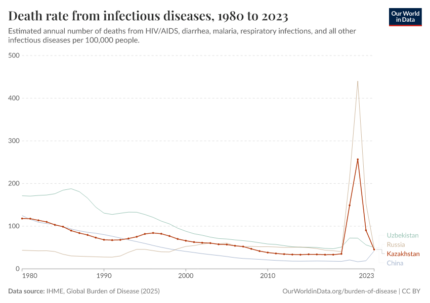 In the chart, you can see how death rates from communicable diseases in Kazakhstan have changed over time. This is shown alongside neighboring countries for comparison.