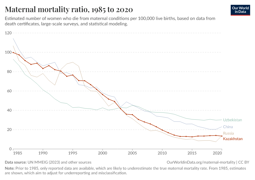 In the chart, you can see Kazakhstan’s maternal mortality rates over time, alongside neighboring countries for comparison. This is measured as the number of deaths per 100,000 live births.