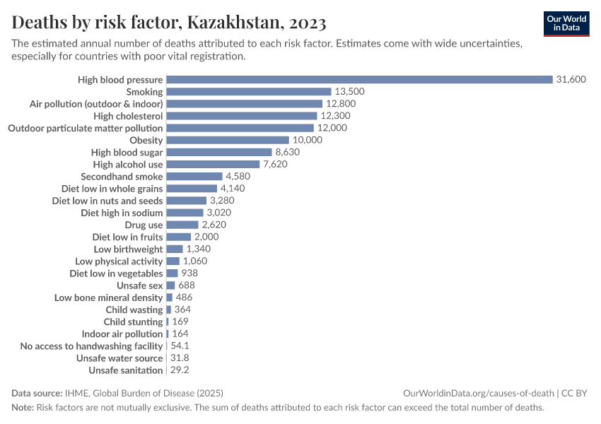 In the chart, you can see modeled estimates for how many people in Kazakhstan die prematurely as a result of various risk factors. Note that the same death can be attributed to multiple risk factors, so the death tolls from different risk factors cannot simply be added up (this is why their sum can be higher than the total number of deaths).