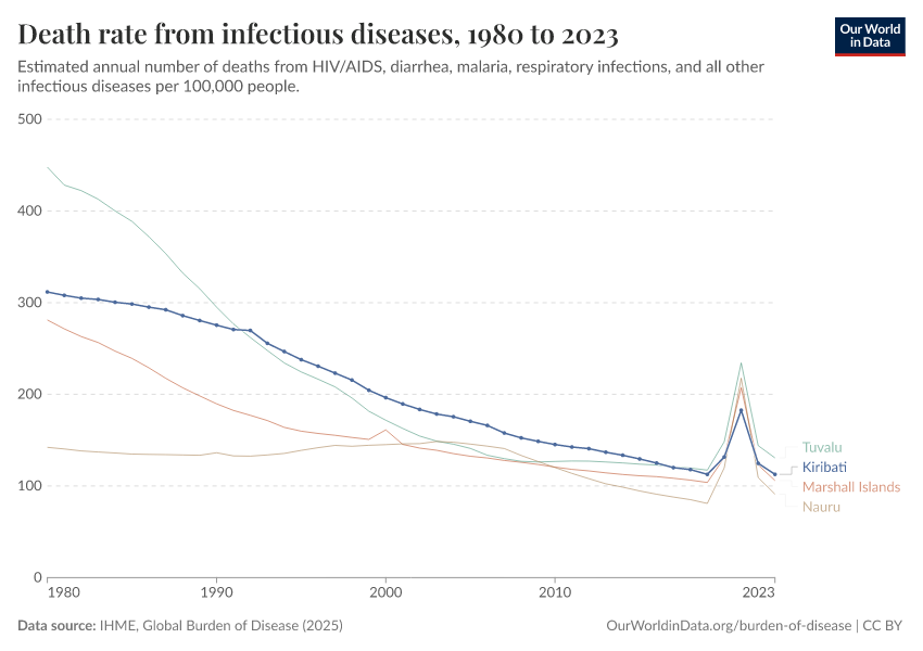 In the chart, you can see how death rates from communicable diseases in Kiribati have changed over time. This is shown alongside neighboring countries for comparison.