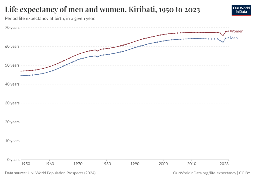 In the chart, you can see life expectancy at birth for men and women in Kiribati.