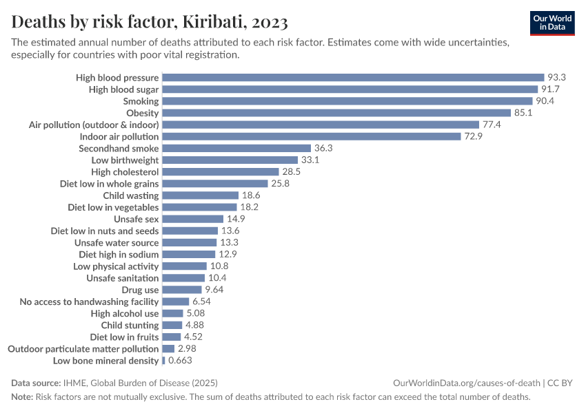 In the chart, you can see modeled estimates for how many people in Kiribati die prematurely as a result of various risk factors. Note that the same death can be attributed to multiple risk factors, so the death tolls from different risk factors cannot simply be added up (this is why their sum can be higher than the total number of deaths).