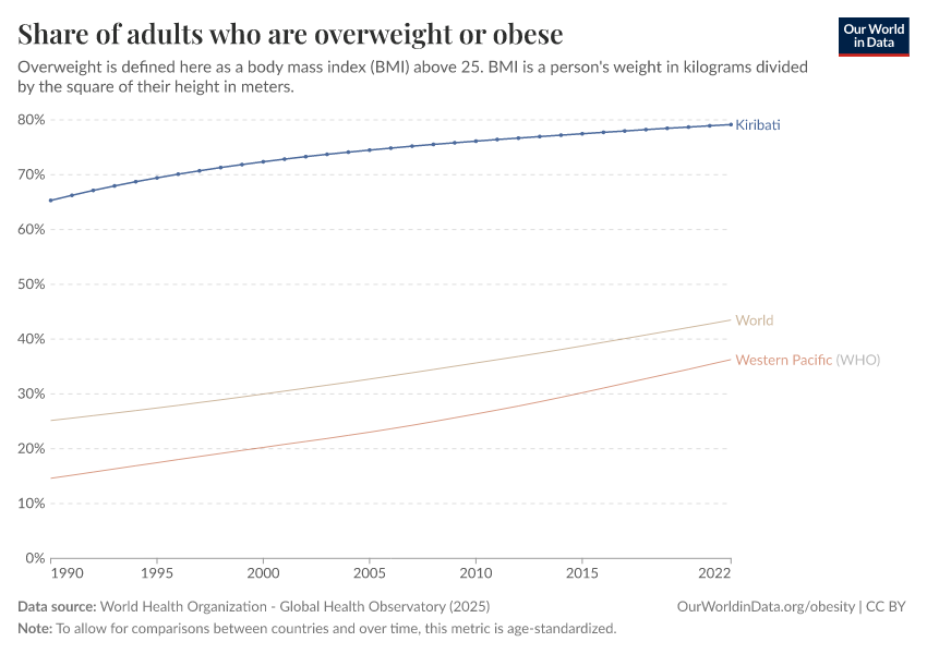 In the chart, you can see the share of adults in Kiribati who are overweight or obese. This is defined as having a body mass index (BMI) equal to or greater than 25. This is shown alongside the global and regional averages.