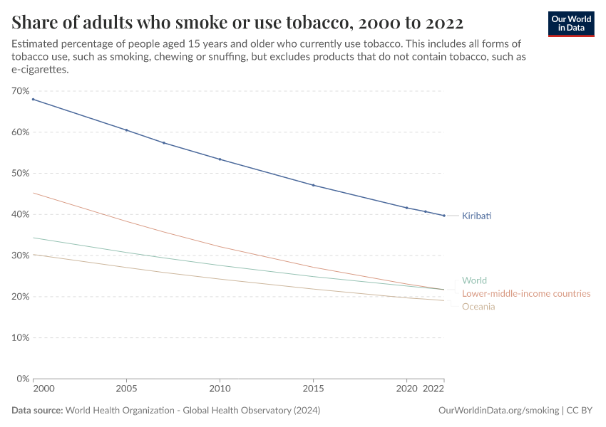 In the chart, you can see the share of adults in Kiribati who use tobacco. This is shown alongside the average globally and regionally.