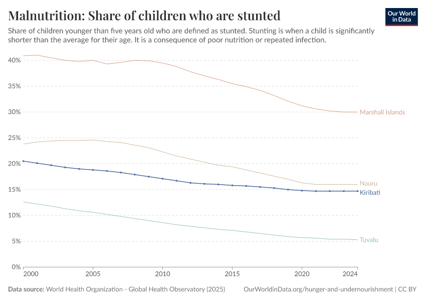 In the chart, you can see what share of children in Kiribati are stunted, alongside neighboring countries. In 2024, this share was 14.7%.