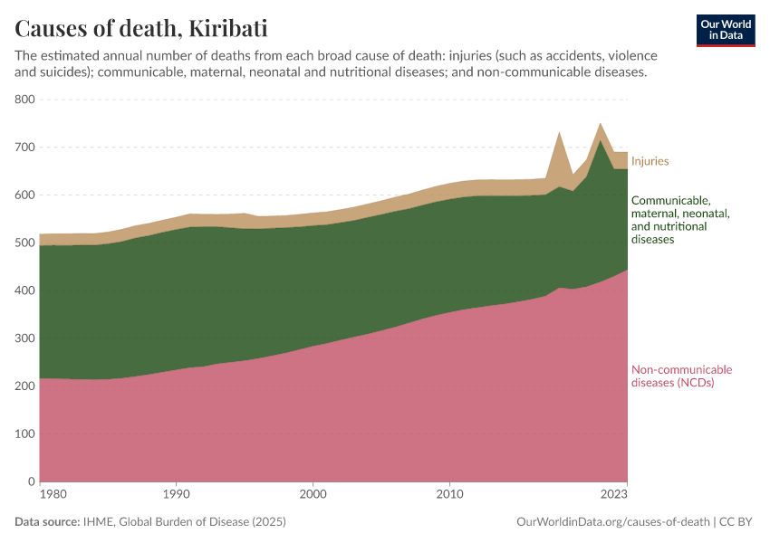 In the chart, you can see the breakdown of deaths in Kiribati by these broad categories. In 2023, 210 died from communicable diseases, 444 from NCDs, and 36.1 from injuries.
