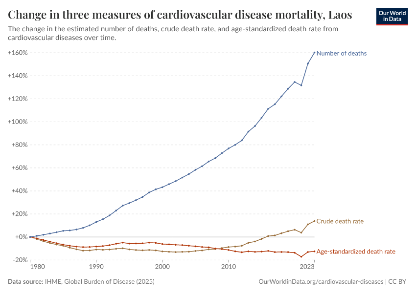 There are several metrics we can use to understand mortality: the total number of deaths, the crude death rate (which simply divides the number of deaths by the country’s population), or the age-standardized death rate, which holds the age structure of the population constant, removing the effect of population aging from the trend.