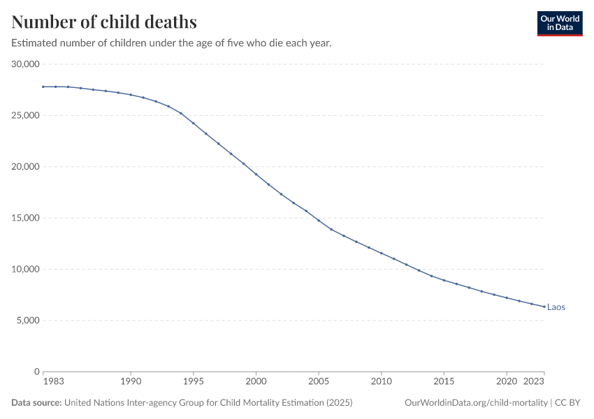 In the chart, you can see the number of children under five in Laos who die in a particular year. In 2023, it was 6,350 children.