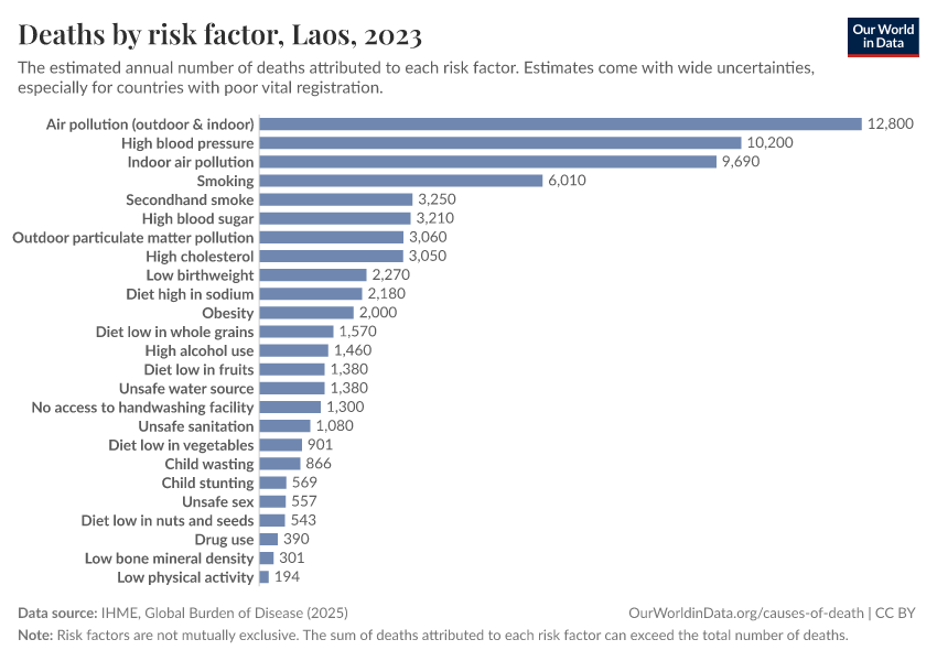 In the chart, you can see modeled estimates for how many people in Laos die prematurely as a result of various risk factors. Note that the same death can be attributed to multiple risk factors, so the death tolls from different risk factors cannot simply be added up (this is why their sum can be higher than the total number of deaths).