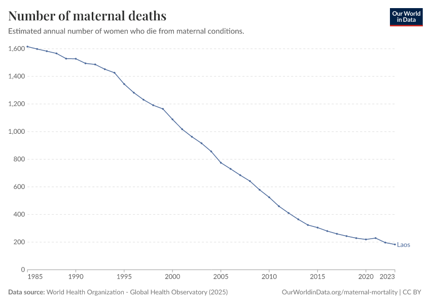 In the chart, you can see the number of women in Laos who died during pregnancy or in childbirth each year. In 2023, this was 183 women.