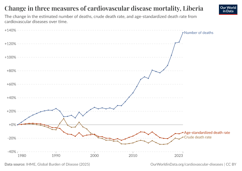 In the chart, you can see how death rates from communicable diseases in Liberia have changed over time. This is shown alongside neighboring countries for comparison.