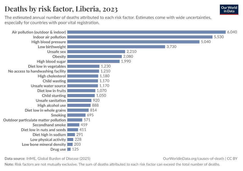 In the chart, you can see modeled estimates for how many people in Liberia die prematurely as a result of various risk factors. Note that the same death can be attributed to multiple risk factors, so the death tolls from different risk factors cannot simply be added up (this is why their sum can be higher than the total number of deaths).