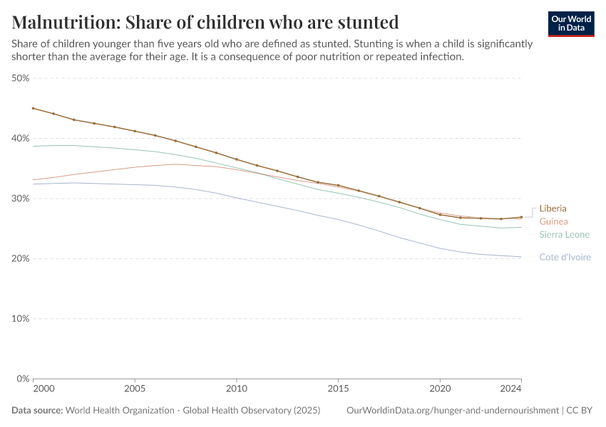 In the chart, you can see what share of children in Liberia are stunted, alongside neighboring countries. In 2024, this share was 26.9%.
