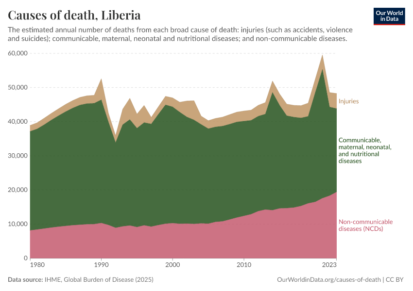 In the chart, you can see the breakdown of deaths in Liberia by these broad categories. In 2023, 24,400 died from communicable diseases, 19,400 from NCDs, and 4,440 from injuries.