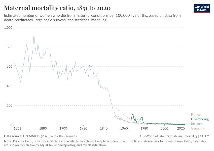 In the chart, you can see Luxembourg’s maternal mortality rates over time, alongside neighboring countries for comparison. This is measured as the number of deaths per 100,000 live births.