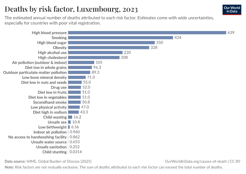 In the chart, you can see modeled estimates for how many people in Luxembourg die prematurely as a result of various risk factors. Note that the same death can be attributed to multiple risk factors, so the death tolls from different risk factors cannot simply be added up (this is why their sum can be higher than the total number of deaths).