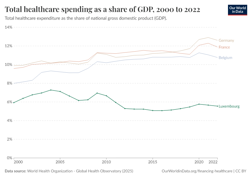 In 2022, Luxembourg’s healthcare spending was equivalent to 5.6% of its national gross domestic product (GDP).