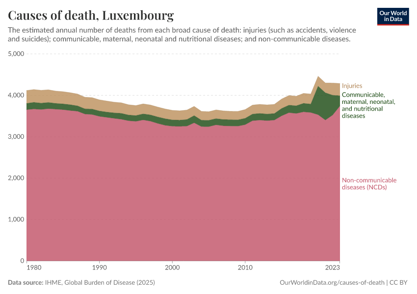 In the chart, you can see the breakdown of deaths in Luxembourg by these broad categories. In 2023, 251 died from communicable diseases, 3,740 from NCDs, and 297 from injuries.