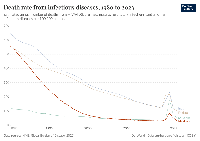 In the chart, you can see how death rates from communicable diseases in the Maldives have changed over time. This is shown alongside neighboring countries for comparison.