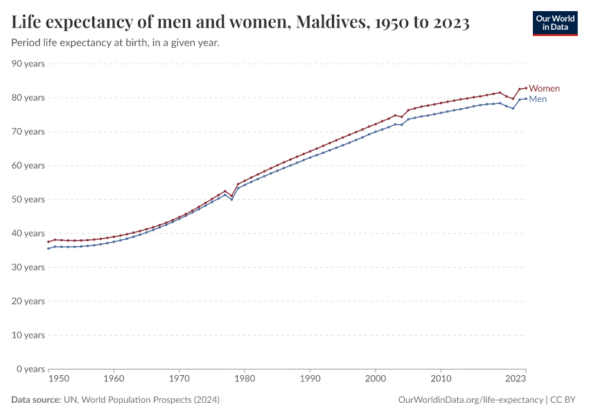 In the chart, you can see life expectancy at birth for men and women in the Maldives.