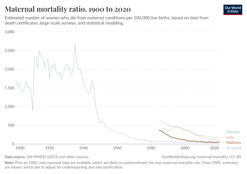 In the chart, you can see the Maldives’ maternal mortality rates over time, alongside neighboring countries for comparison. This is measured as the number of deaths per 100,000 live births.