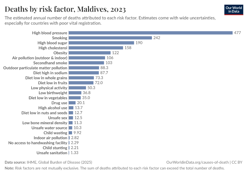 In the chart, you can see modeled estimates for how many people in the Maldives die prematurely as a result of various risk factors. Note that the same death can be attributed to multiple risk factors, so the death tolls from different risk factors cannot simply be added up (this is why their sum can be higher than the total number of deaths).