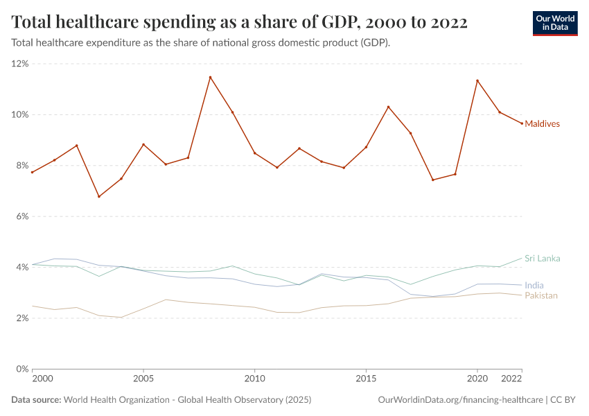 How much does the Maldives spend on healthcare as a share of GDP?