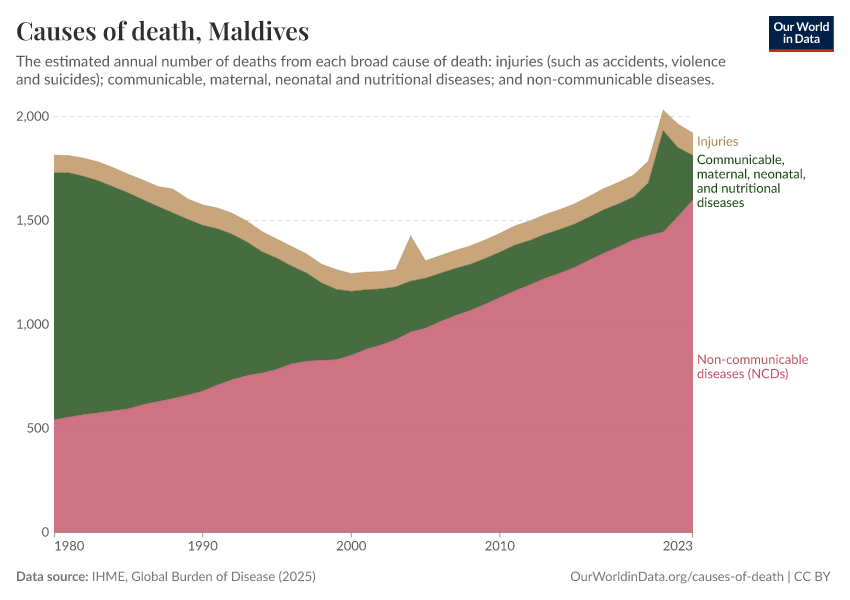 In the chart, you can see the breakdown of deaths in the Maldives by these broad categories. In 2023, 214 died from communicable diseases, 1,600 from NCDs, and 107 from injuries.