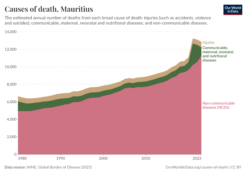 In the chart, you can see the breakdown of deaths in Mauritius by these broad categories. In 2023, 989 died from communicable diseases, 11,300 from NCDs, and 619 from injuries.