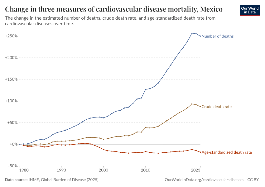 There are several metrics we can use to understand mortality: the total number of deaths, the crude death rate (which simply divides the number of deaths by the country’s population), or the age-standardized death rate, which holds the age structure of the population constant, removing the effect of population aging from the trend.