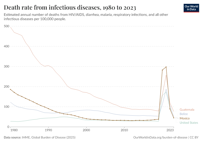 In the chart, you can see how death rates from communicable diseases in Mexico have changed over time. This is shown alongside neighboring countries for comparison.