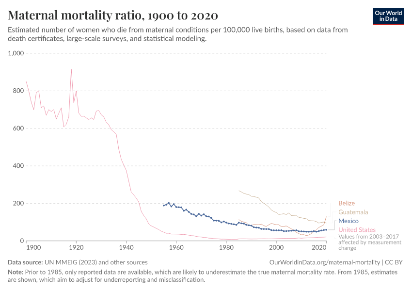 In the chart, you can see Mexico’s maternal mortality rates over time, alongside neighboring countries for comparison. This is measured as the number of deaths per 100,000 live births.