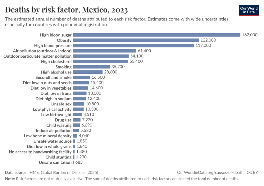 In the chart, you can see modeled estimates for how many people in Mexico die prematurely as a result of various risk factors. Note that the same death can be attributed to multiple risk factors, so the death tolls from different risk factors cannot simply be added up (this is why their sum can be higher than the total number of deaths).