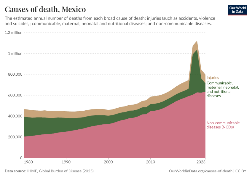In the chart, you can see the breakdown of deaths in Mexico by these broad categories. In 2023, 78,400 died from communicable diseases, 634,000 from NCDs, and 83,900 from injuries.