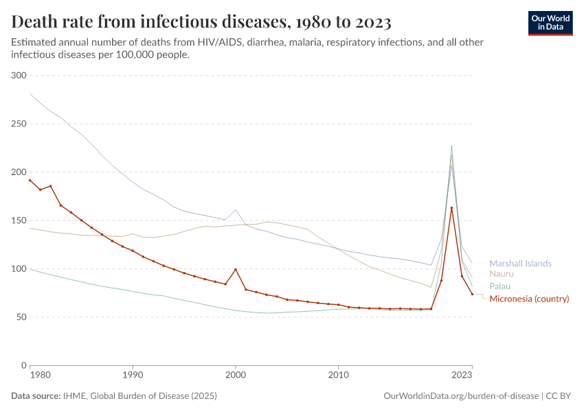 In the chart, you can see how death rates from communicable diseases in Micronesia (country) have changed over time. This is shown alongside neighboring countries for comparison.