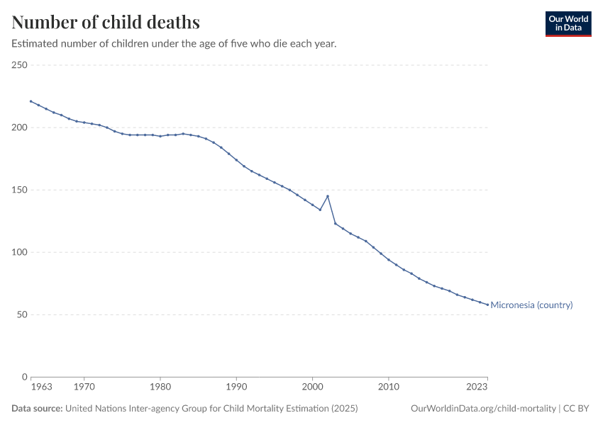 In the chart, you can see the number of children under five in Micronesia (country) who die in a particular year. In 2023, it was 58.0 children.