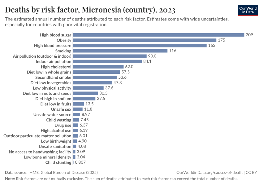 In the chart, you can see modeled estimates for how many people in Micronesia (country) die prematurely as a result of various risk factors. Note that the same death can be attributed to multiple risk factors, so the death tolls from different risk factors cannot simply be added up (this is why their sum can be higher than the total number of deaths).
