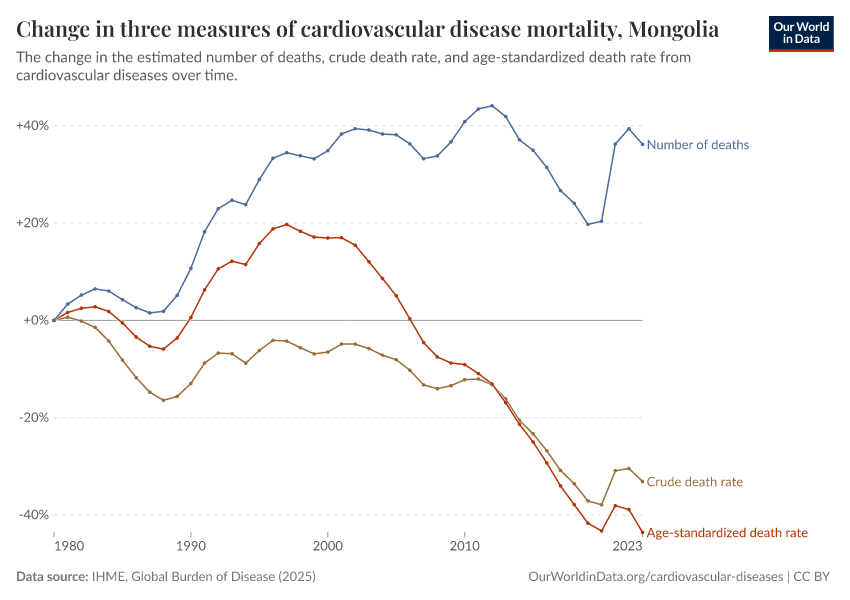 There are several metrics we can use to understand mortality: the total number of deaths, the crude death rate (which simply divides the number of deaths by the country’s population), or the age-standardized death rate, which holds the age structure of the population constant, removing the effect of population aging from the trend.