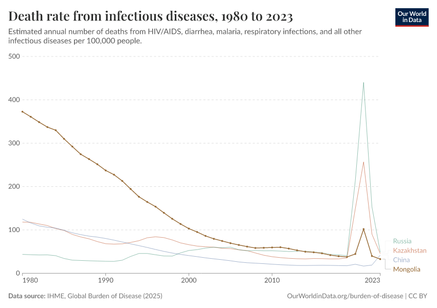 In the chart, you can see how death rates from communicable diseases in Mongolia have changed over time. This is shown alongside neighboring countries for comparison.