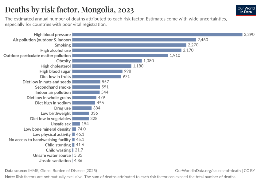 In the chart, you can see modeled estimates for how many people in Mongolia die prematurely as a result of various risk factors. Note that the same death can be attributed to multiple risk factors, so the death tolls from different risk factors cannot simply be added up (this is why their sum can be higher than the total number of deaths).