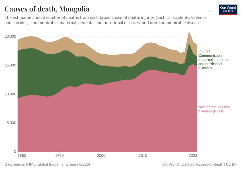In the chart, you can see the breakdown of deaths in Mongolia by these broad categories. In 2023, 1,580 died from communicable diseases, 14,900 from NCDs, and 2,060 from injuries.