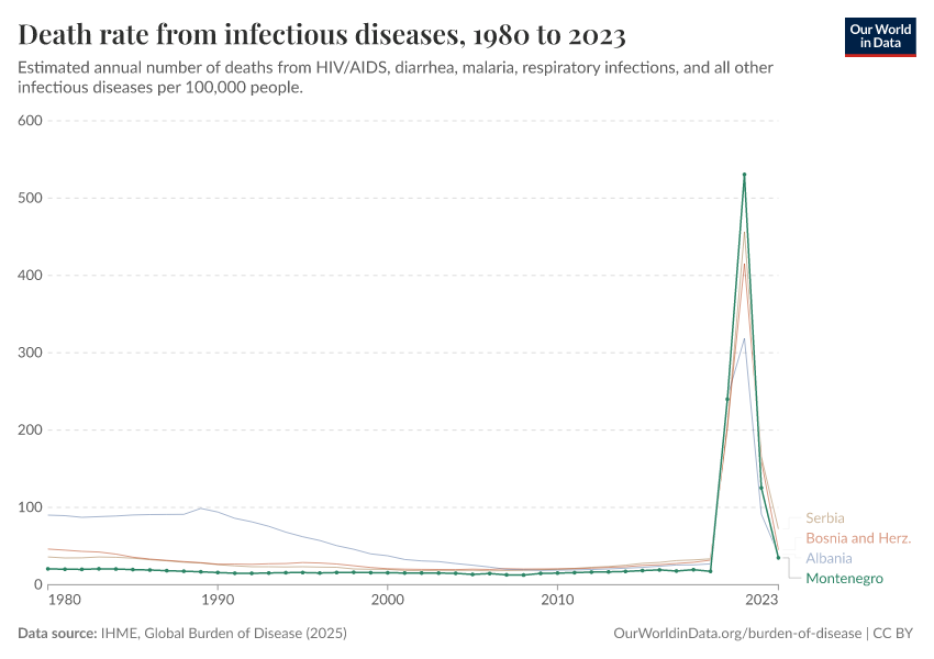 In the chart, you can see how death rates from communicable diseases in Montenegro have changed over time. This is shown alongside neighboring countries for comparison.
