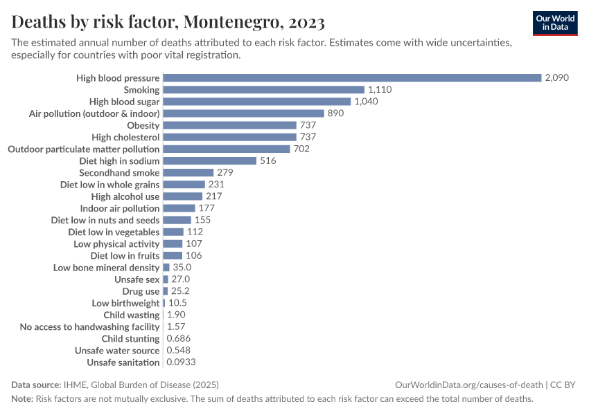 In the chart, you can see modeled estimates for how many people in Montenegro die prematurely as a result of various risk factors. Note that the same death can be attributed to multiple risk factors, so the death tolls from different risk factors cannot simply be added up (this is why their sum can be higher than the total number of deaths).