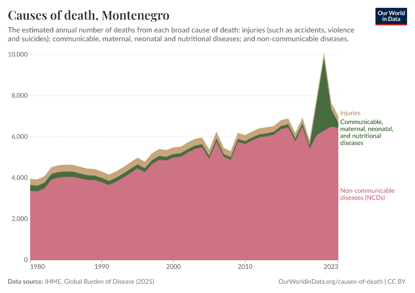 In the chart, you can see the breakdown of deaths in Montenegro by these broad categories. In 2023, 246 died from communicable diseases, 6,430 from NCDs, and 309 from injuries.