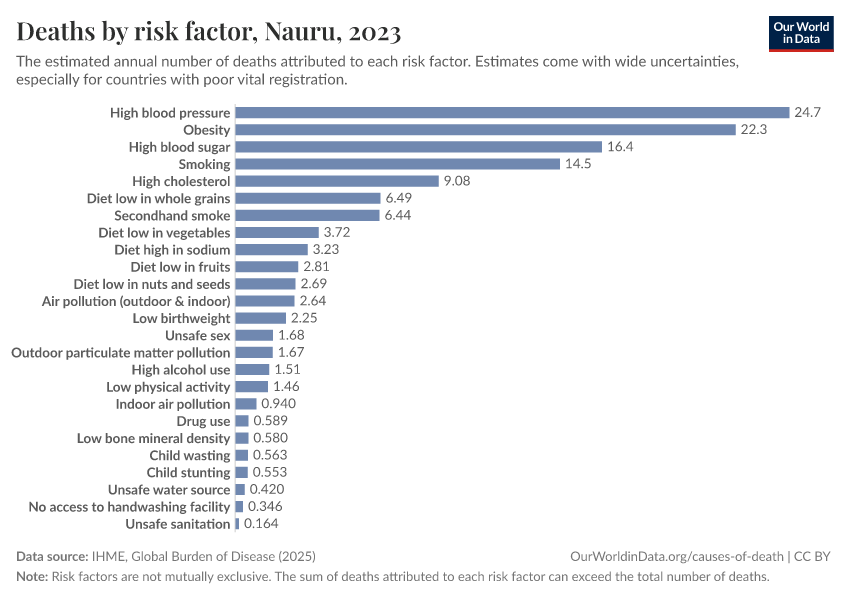 In the chart, you can see modeled estimates for how many people in Nauru die prematurely as a result of various risk factors. Note that the same death can be attributed to multiple risk factors, so the death tolls from different risk factors cannot simply be added up (this is why their sum can be higher than the total number of deaths).