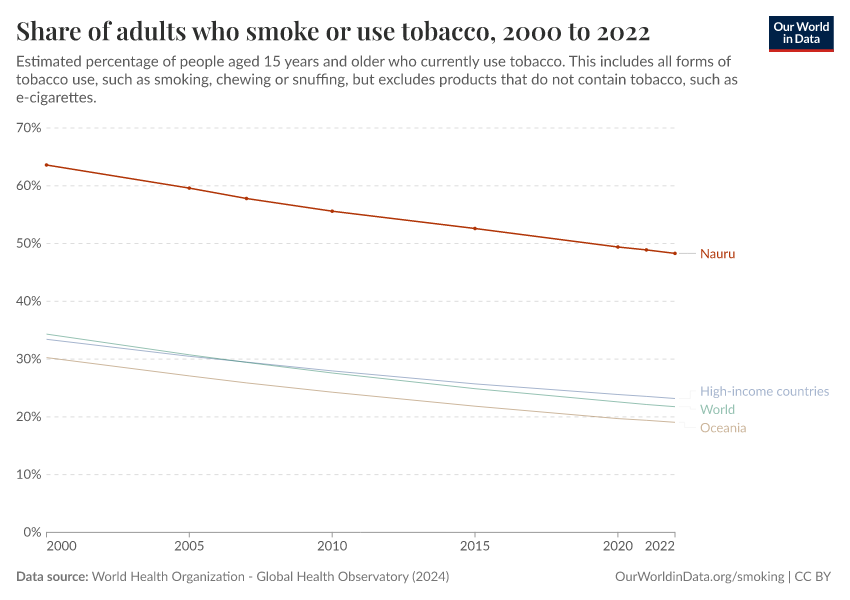 In the chart, you can see the share of adults in Nauru who use tobacco. This is shown alongside the average globally and regionally.