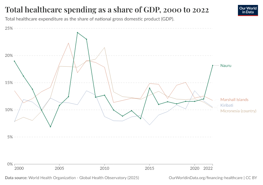 In 2022, Nauru’s healthcare spending was equivalent to 18% of its national gross domestic product (GDP).