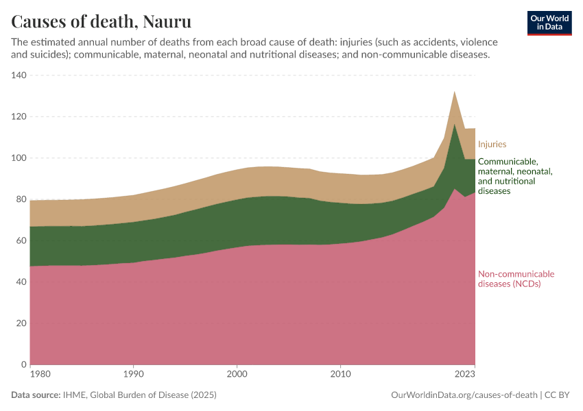 In the chart, you can see how death rates from communicable diseases in Nauru have changed over time. This is shown alongside neighboring countries for comparison.
